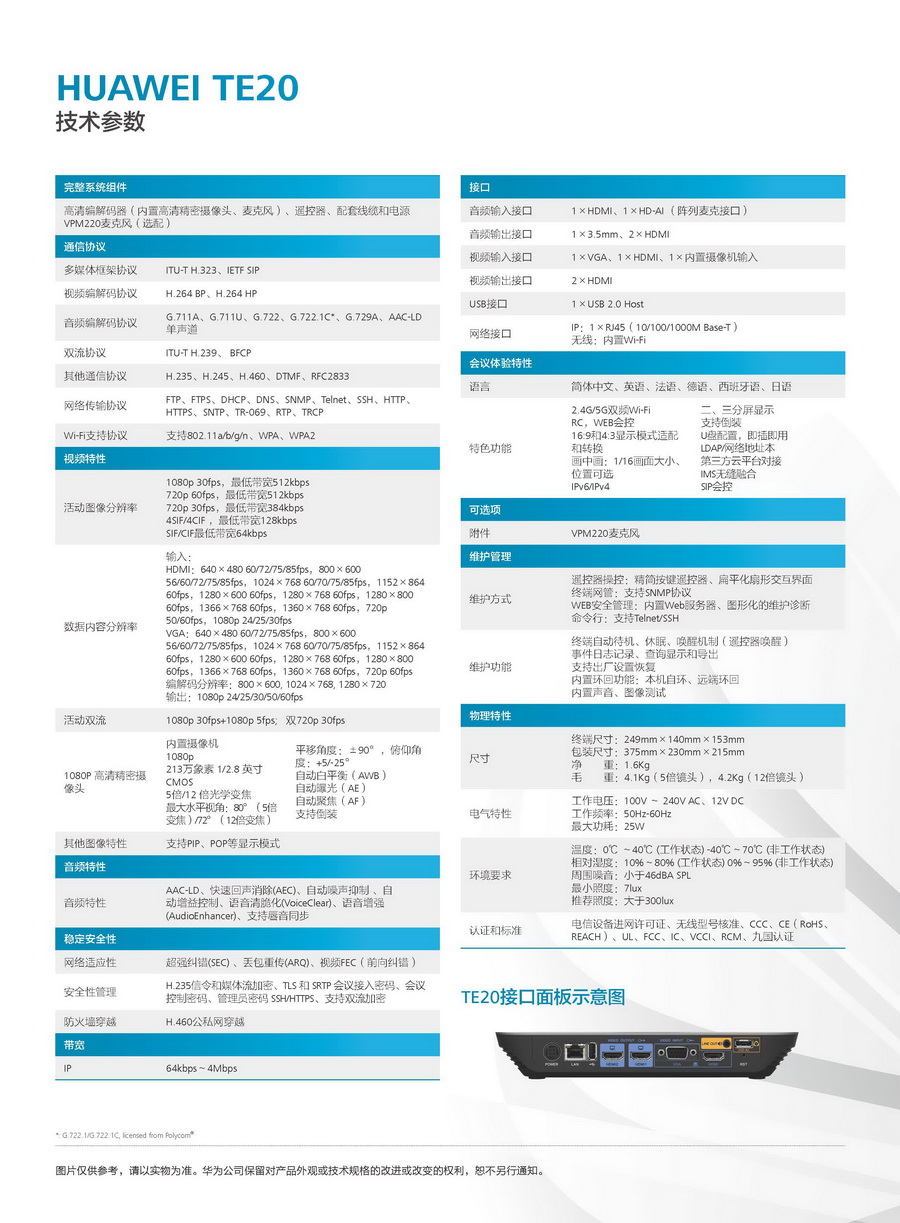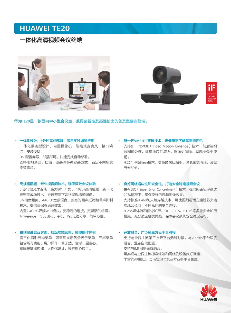 华为TE20是一款面向中小型会议室,兼具创新性及高性价比的普及型会议终端。