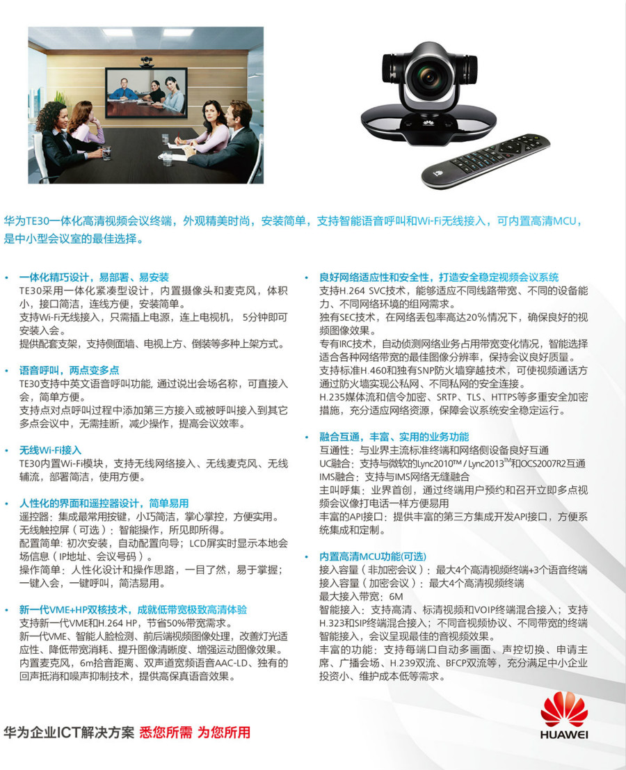 华为TE30一体化高清视频会议终端,外观精美时尚,安装简单,支持智能语音呼叫和Wi-Fi无线接入,可内置高清MCU,是中小型会议室的最佳选择。
