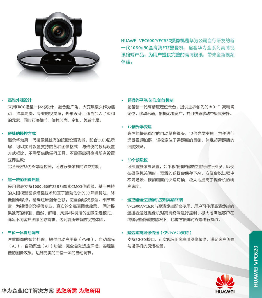 HUAWEI VPC600/VPC620摄像机是华为公司自行研发的新一代1080p60全高清PTZ摄像机,配套华为全系列高清视讯终端产品,为用户提供完整的高清视讯,带来全新视频体验。