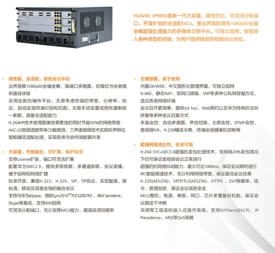 HUAWEI VP9650是新一代大容量、高性价比、可灵活分配端口、平滑扩容的全适配MCU,是业界首款具有1080p60全编全解超强处理能力的多媒体交换平台。可独立组网,智能接入各种类型的终端,为用户提供极致的视频会议体验。